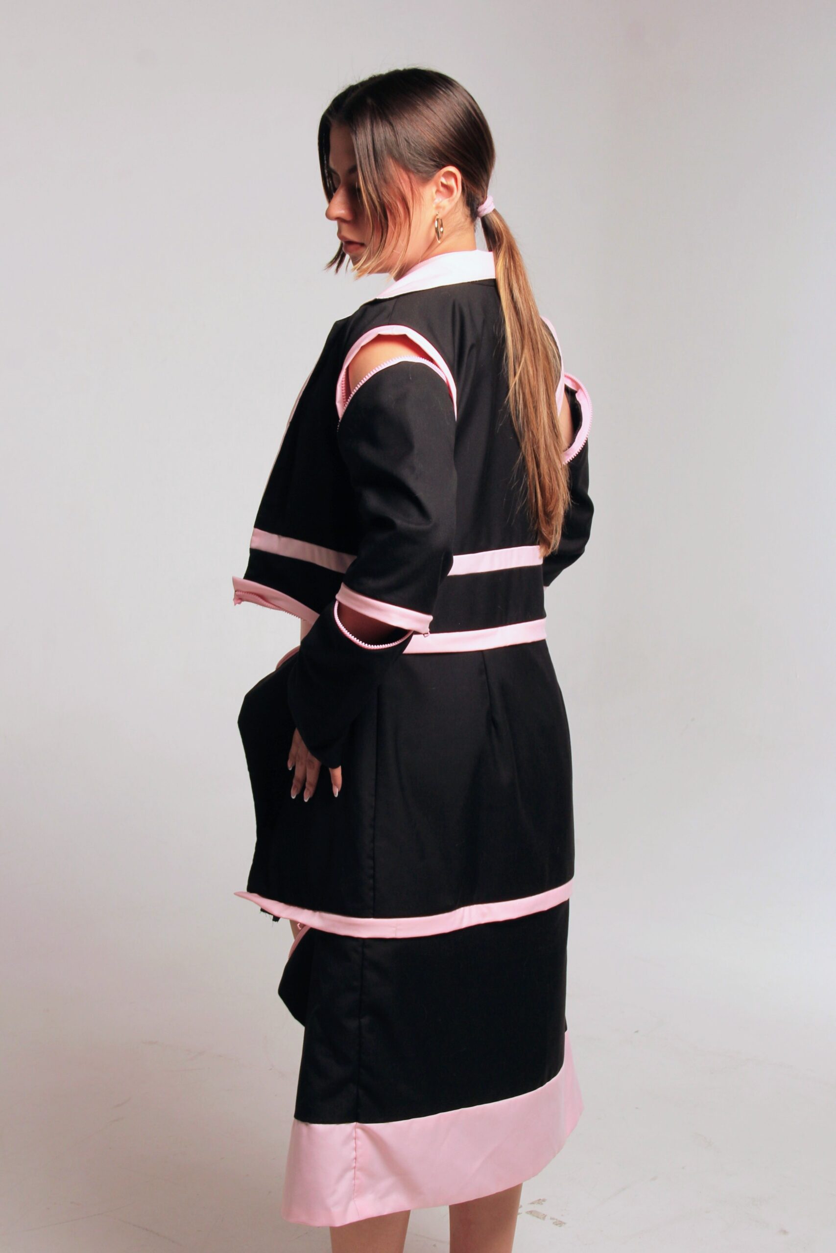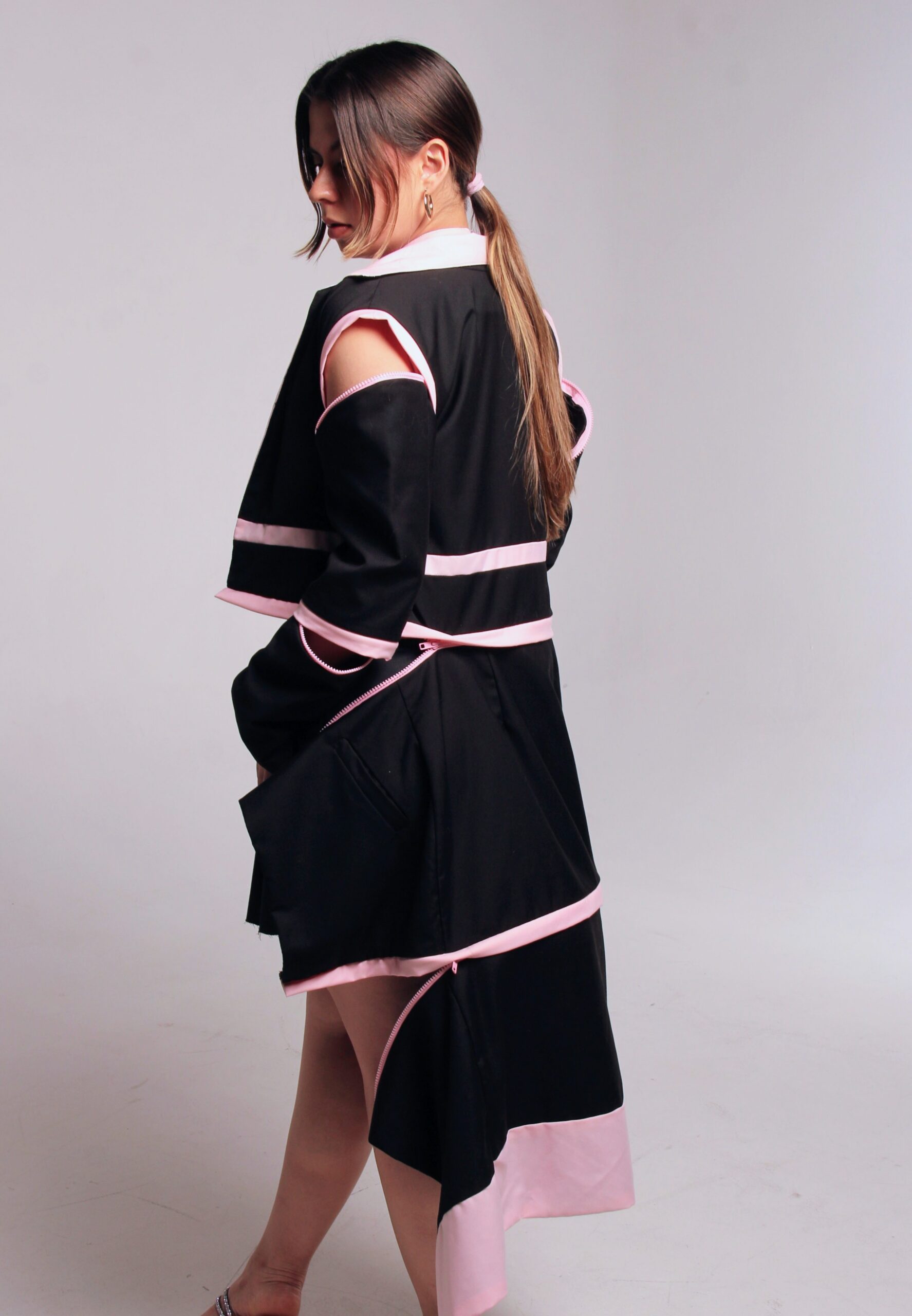 Detach es una colección de ropa femenina que responde a la sobreproducción en la moda. Esta propuesta se basa en prendas con uniones ocultas que permiten transformaciones y múltiples usos, ofreciendo a la mujer contemporánea soluciones funcionales, versátiles y estéticas en un solo vestuario.
